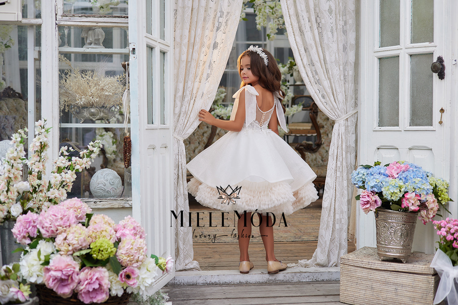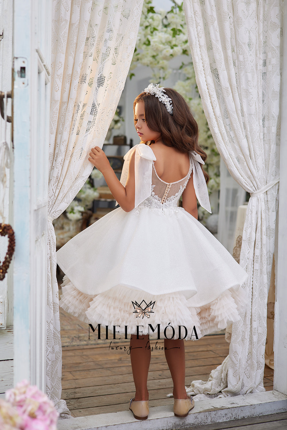 On the Cart page, please add all additional information regarding the customization of your order, for example - your child's exact measurements, train or no train, etc. We do require the following measurements: Chest, Waist and Length from Underarm to Hem (where you would like the dress to end). If your gown has sleeves, please also include the Bicep circumference, sleeve length from shoulder to wrist and wrist circumference. Use the bellow guide for guidance on how to correctly measure. If you need further help taking the correct measurements, please email us at mielemoda@gmail.com