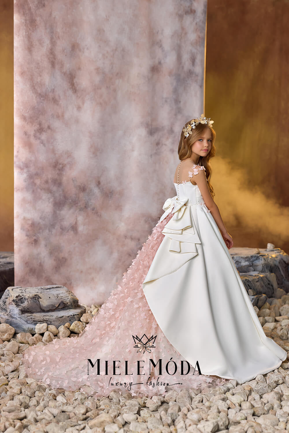 Our Moonlit Elegance luxury flower girl and party dress is a captivating gown designed to make every little girl shine. This floor-length, full-circle dress features a multi-layered skirt that creates a magical princess-like flow, while the pleated fitted bodice is accented with hand-stitched whimsical beadwork for an added touch of sparkle. The illusion neckline and sleeves are adorned with delicate beads and 3D cut butterflies, creating an enchanting effect. Made from the finest European lace, satin, and mesh fabrics, this gown showcases an elegant ballroom silhouette with a graceful lace train overlay and a stylish slit. A butterfly-embellished and beaded waistline completes the look, offering timeless charm. The dress is fully lined with soft fabric for ultimate comfort, and the secure zipper and button closure ensure the perfect fit. Ideal for flower girls and special events, this gown is a true statement piece!