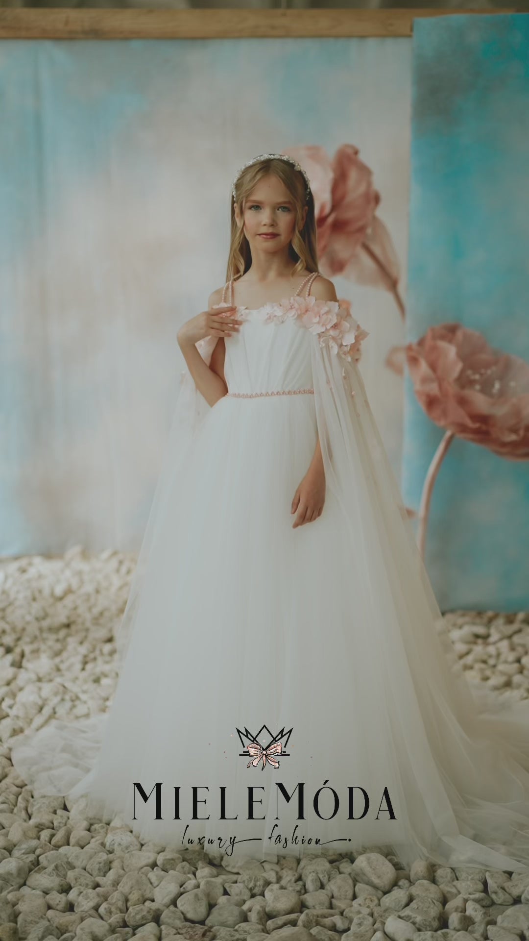 The Opal Cascade is a breathtaking blend of elegance and whimsy, perfect for the most enchanting occasions. This floor-length dress features a multi-layered skirt that cascades with grace, creating a dreamy, ballroom-worthy silhouette. The fitted bodice is beautifully adorned with hand-stitched beadwork and floral appliqués, while the fashionable neckline and beaded straps add a modern touch. Long cold-shoulder sleeves lend a sophisticated yet playful vibe, making this dress stand out. Crafted from the finest European lace and satin fabrics, the Opal Cascade is finished with a pearl-embellished waistline and a graceful train. With a secure zipper and button closure, plus soft full lining, this dress offers premium comfort and a flawless fit for any flower girl, party, or First Communion.