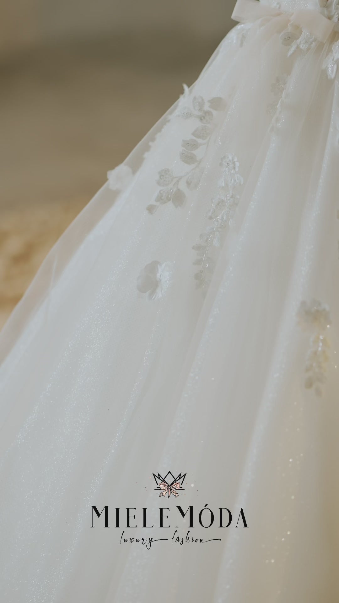 The Petal Chiffon couture first communion dress is a stunning blend of whimsy and elegance, perfect for any special occasion. Its fitted bodice is adorned with delicate embroidered lace appliqués, while the illusion neckline, crafted from nude mesh fabric, features exquisite hand-stitched beadwork for a touch of sparkle. The sheer cap sleeves with intricate lace and frills add a charming, ethereal feel. Made from the finest European lace and mesh fabrics, this dress showcases a floor-length, multi-layered tulle princess skirt with an elegant ballroom silhouette and a graceful long train. The lace and bow-embellished waistline add a sweet, playful detail, while the zipper and button closure ensures a secure fit. Fully lined for comfort, this gown is a true masterpiece.