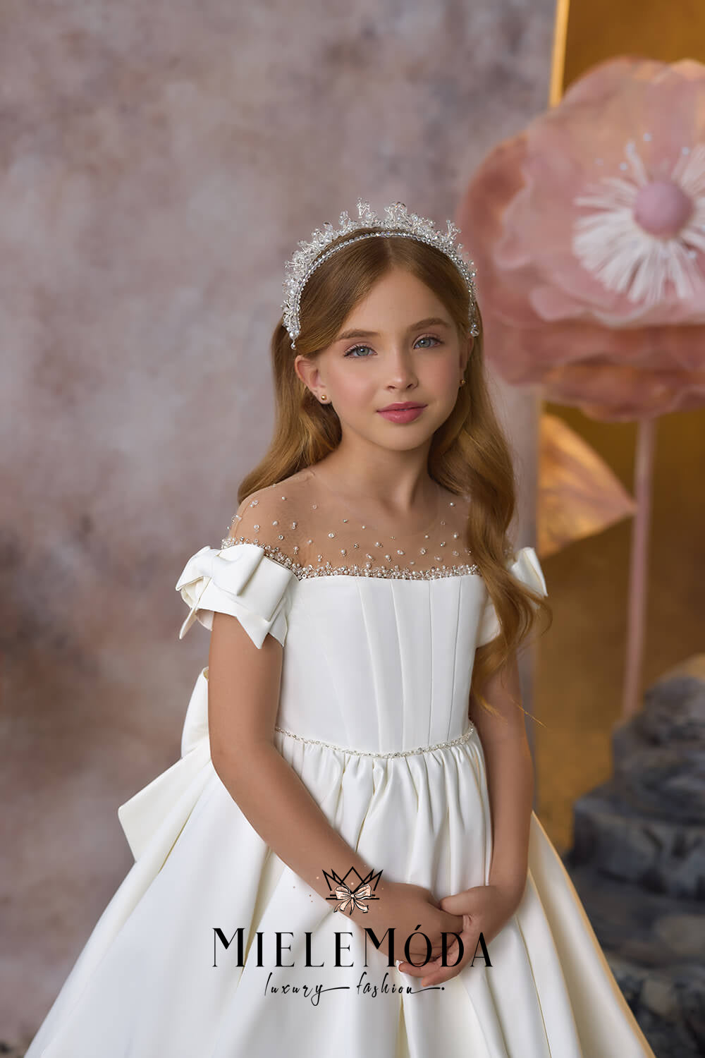 The Radiant Ivy luxury flower girl and party dress is a stunning embodiment of elegance and charm. Designed for memorable occasions, this gown features a floor-length, full-circle princess skirt, and a fitted pleated bodice adorned with hand-stitched beadwork that adds a touch of sparkle. The illusion neckline and delicate cap sleeves, accented with charming bow details, offer a graceful silhouette. An oversized bow at the waistline enhances the ballroom silhouette, complemented by a long, flowing train. Crafted from the finest European lace, satin, and mesh fabrics, it offers premium comfort with a fully lined interior, perfect for making any little girl feel like a princess. The dress is completed with a zipper and buttons closure for a secure fit. Ideal for flower girls, first communions, and many special events!
