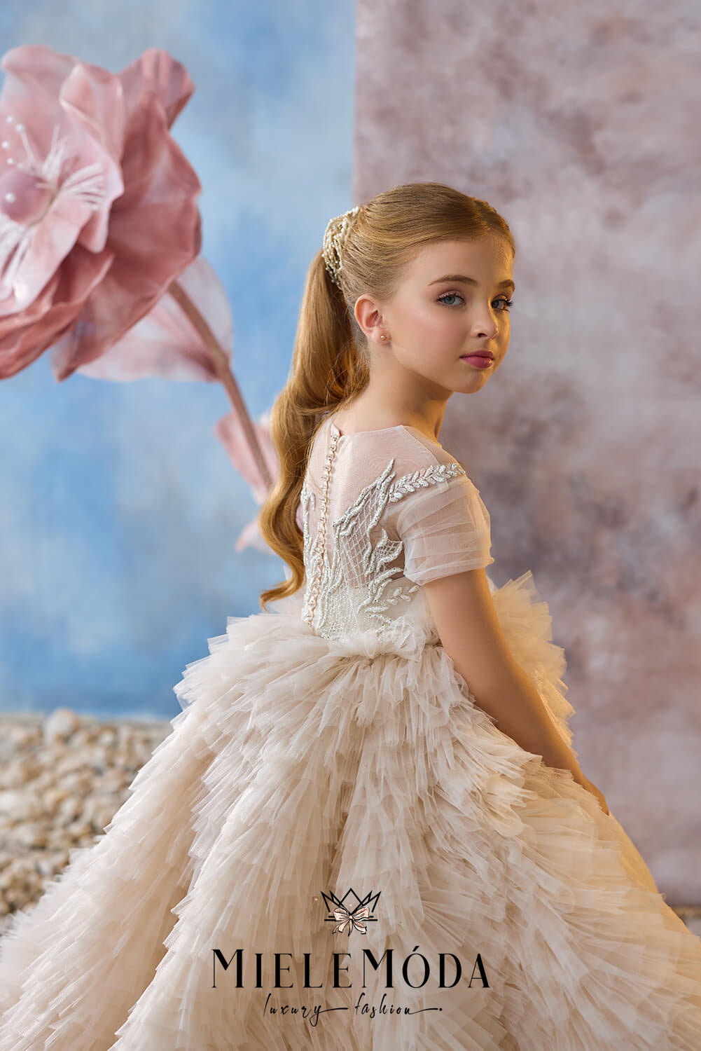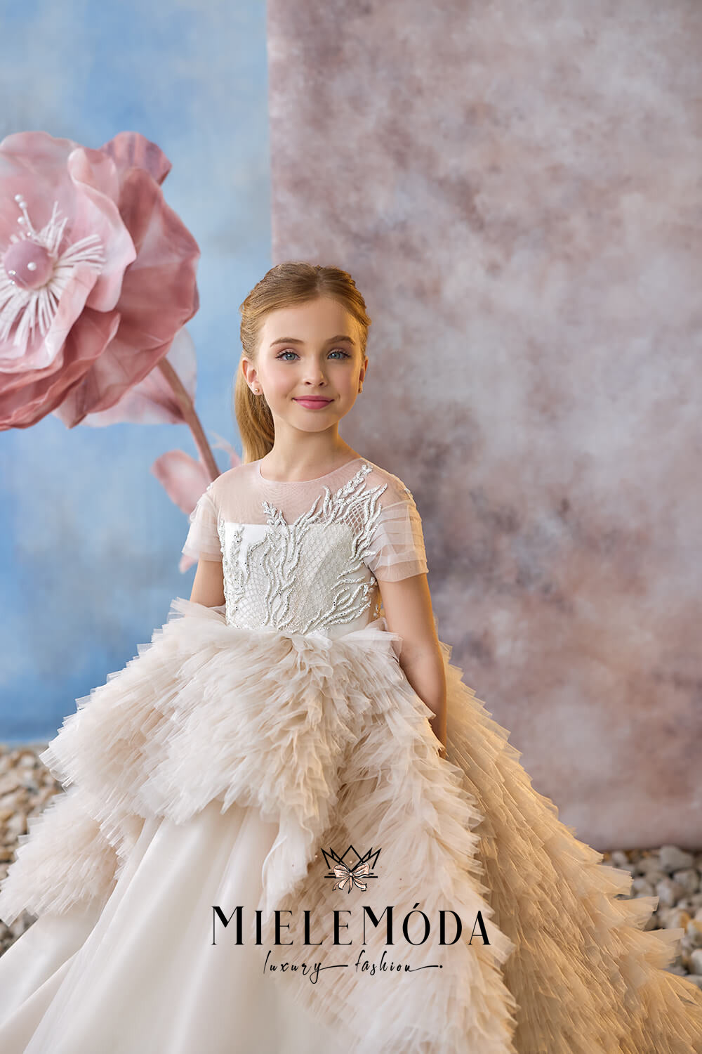 Step into a world of elegance with the "Celestial Dream" flower girl dress, a masterpiece designed for a wedding guest or birthday party princess. Crafted for the little princess, this exquisite dress is the epitome of timeless beauty and sophistication, perfect for the most enchanting occasions.