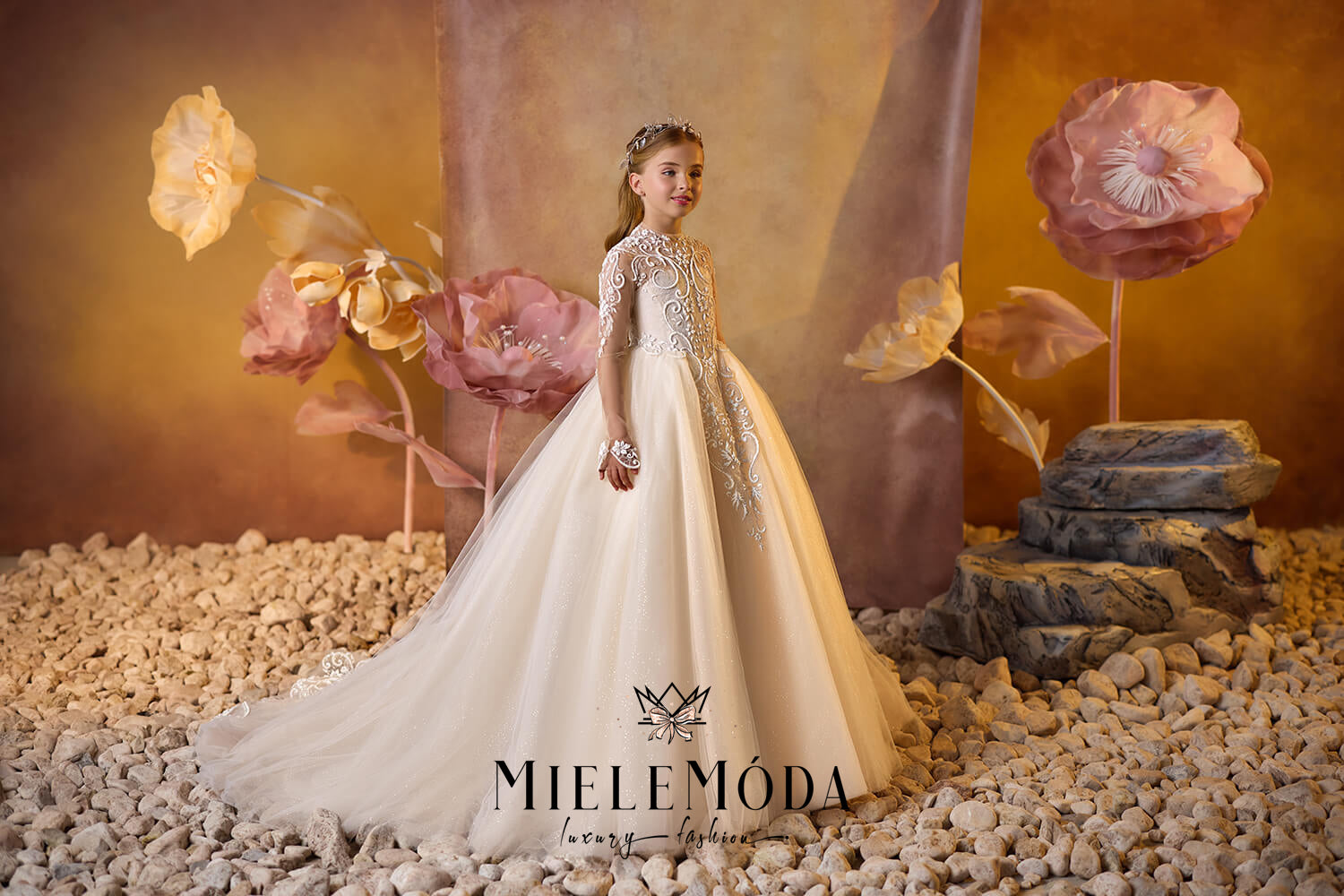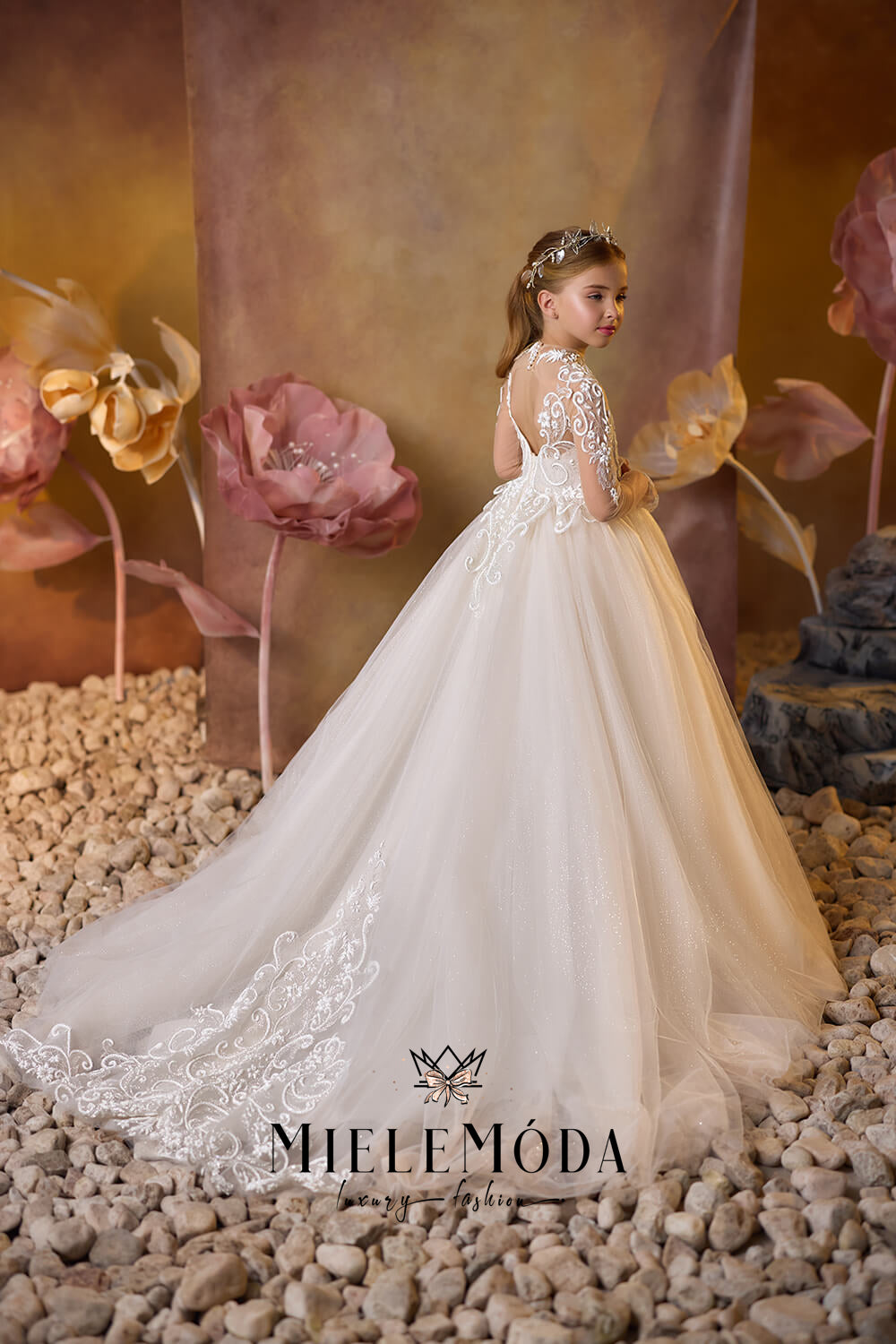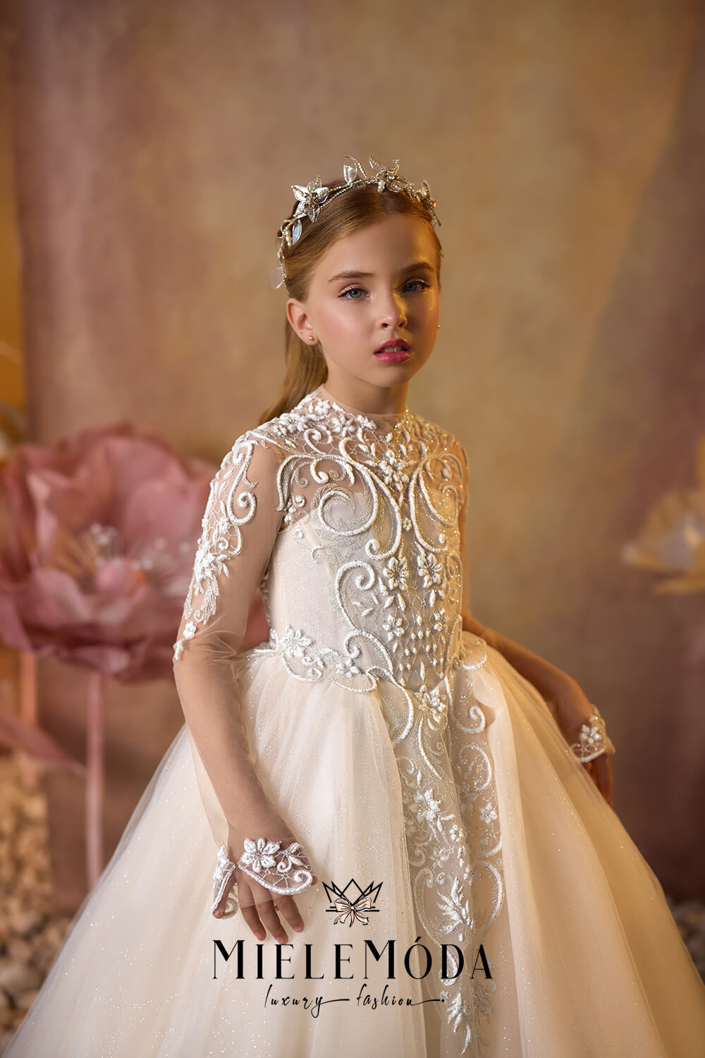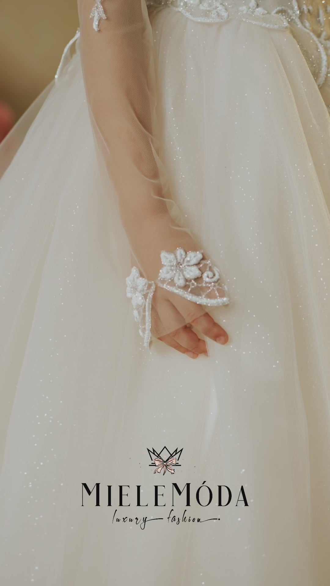 Gilded Ivy Luxury flower girl and first communion dress is a breathtaking blend of grace and sophistication, designed to make your little one stand out on her special day. The fitted bodice is adorned with whimsical embroidered lace appliqués, offering a touch of timeless elegance, while the high illusion neckline with nude mesh fabric adds a modern twist. The dress features a delicate keyhole back and long sheer sleeves, beautifully detailed with intricate lace appliqué, making it perfect for weddings or first communions. Crafted from the finest quality European lace and mesh fabrics, the floor-length, full-circle multilayered tulle princess skirt flows effortlessly into an elegant ballroom silhouette with a graceful long train. The lace-embellished waistline adds a final touch of charm, while the secure zipper and buttons closure ensures a perfect fit. Fully lined with soft fabric for premium comfort, the Gilded Ivy dress is the ideal choice for moms and brides looking to combine luxury, beauty, and comfort in a flower girl or first communion dress.