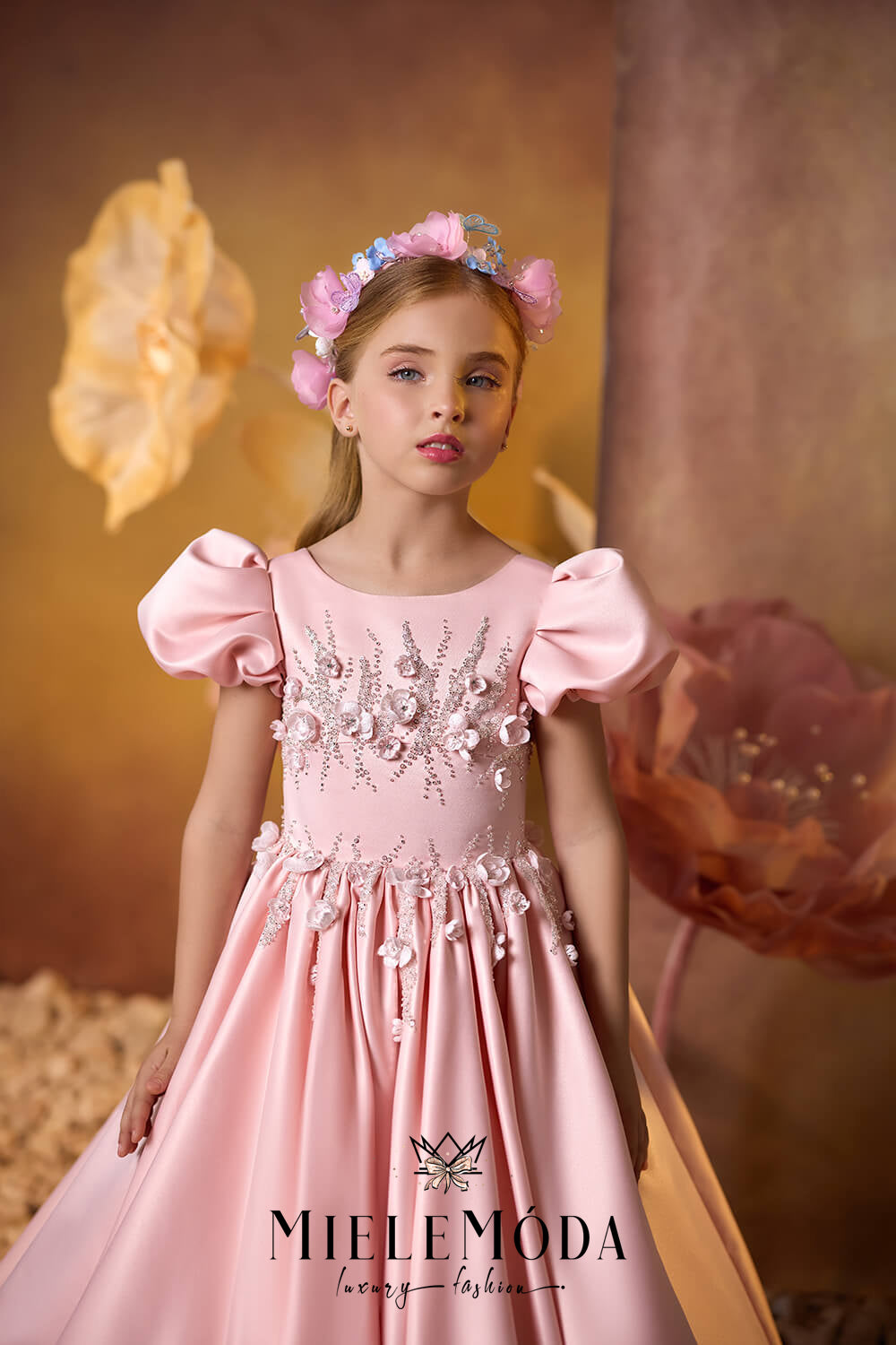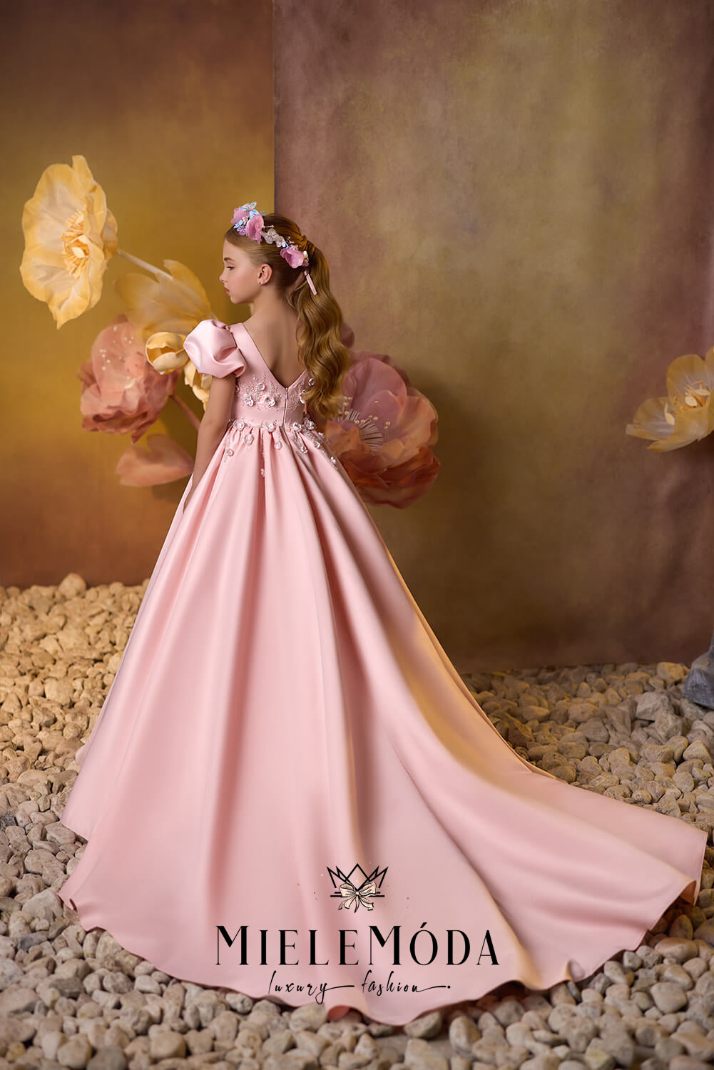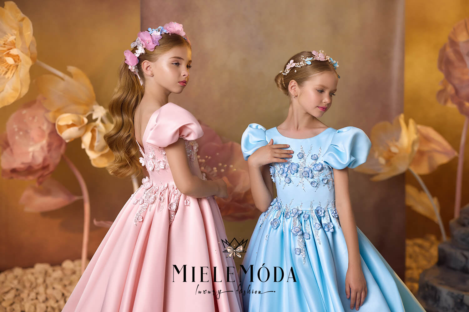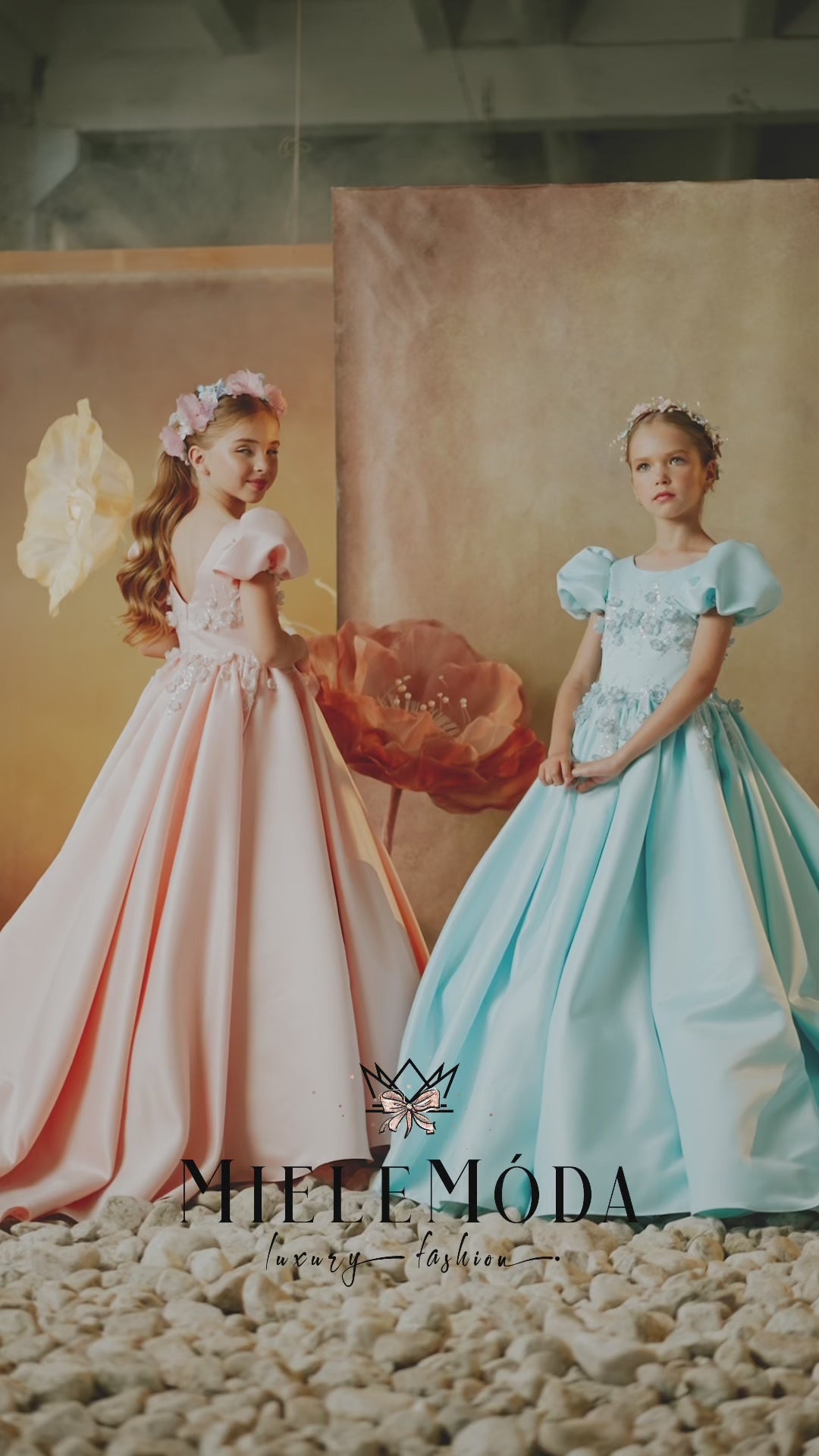 The Ivy Blossom Luxury Flower Girl and First Communion Dress is a stunning blend of whimsy and elegance, perfect for making your little one shine on her special day. Crafted from the finest quality European fabrics, this dress features a fitted bodice beautifully accented with hand-stitched whimsical flowers, adding a touch of magic to the look. The V-shaped back neckline and short puffy sleeves enhance its timeless charm, while the voluminous full-circle, multi layered, pleated princess skirt creates an unforgettable silhouette. With an elegant ballroom design and a graceful long train, the dress is finished with an embellished waistline for extra sparkle. Available in four enchanting colors, this gown is perfect for weddings or first communion celebrations. The zipper closure ensures a secure fit, and the fully lined interior provides premium comfort, making it a top choice for moms and brides seeking the perfect flower girl dress.