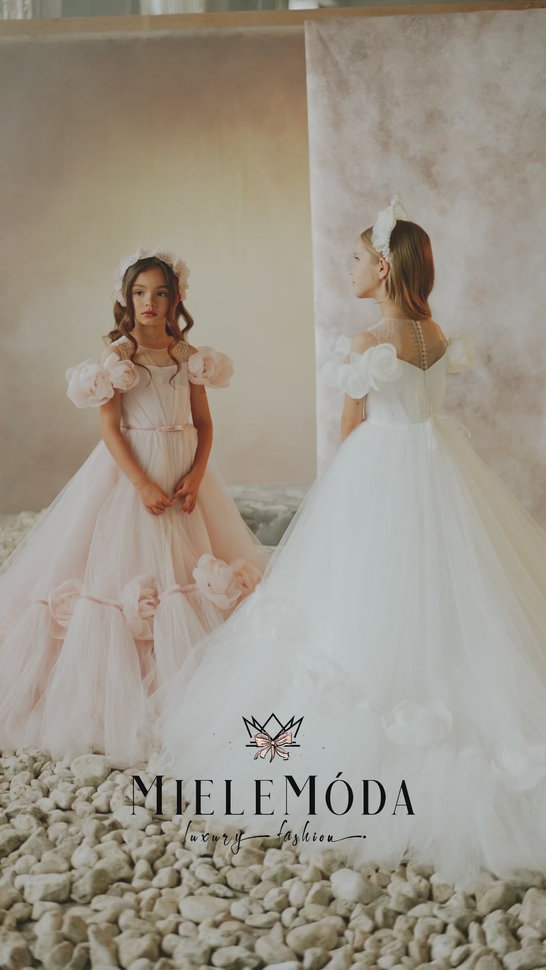 Indulge in luxury with our Luna Petal couture flower girl dress. The full circle, multi layered skirt is made out of the softest European tulle and mesh fabrics, creating an elegant ballroom silhouette. The cascading gentle florals adorn the voluminous skirt making this gown the perfect choice for a flower girl at a whimsical garden summer wedding. A graceful long train and embellished waistline complete the look. Perfect for your little princess next special occasion.