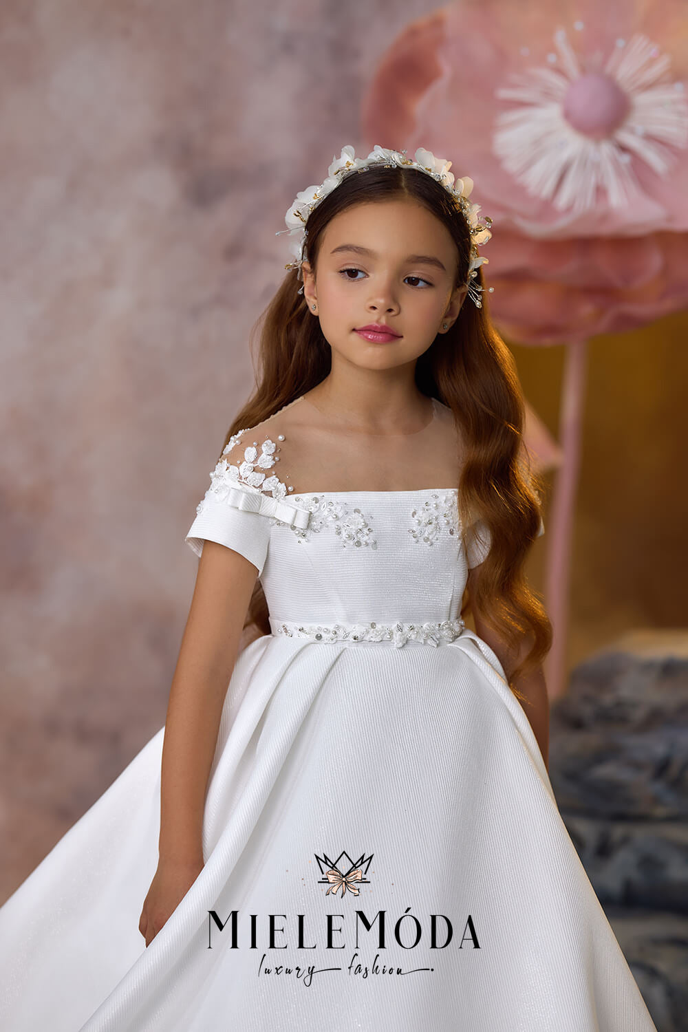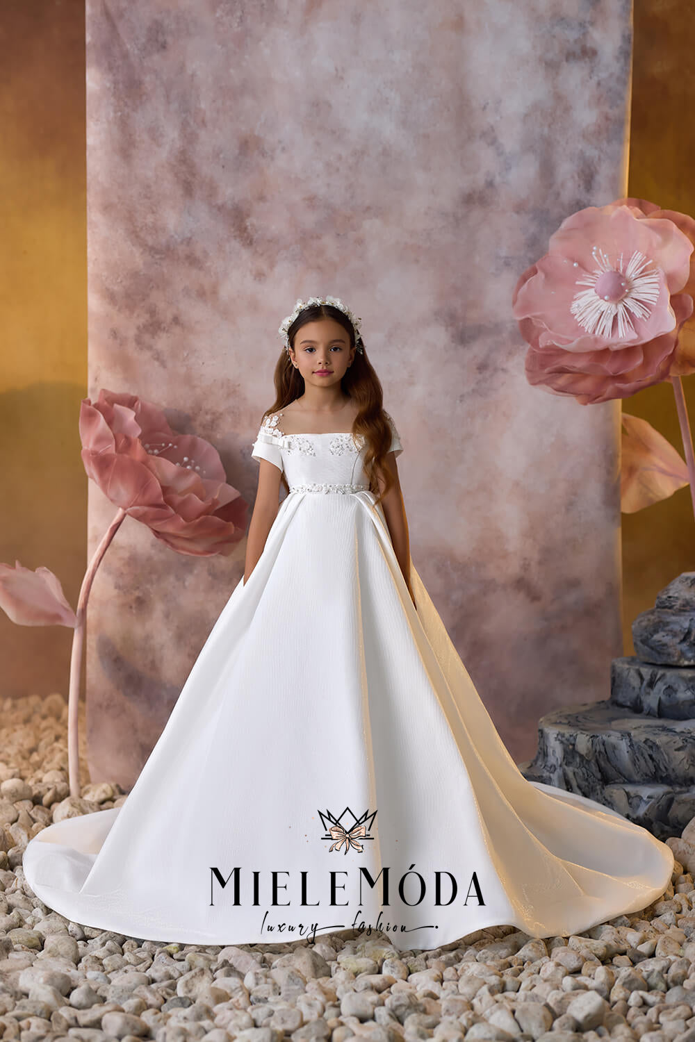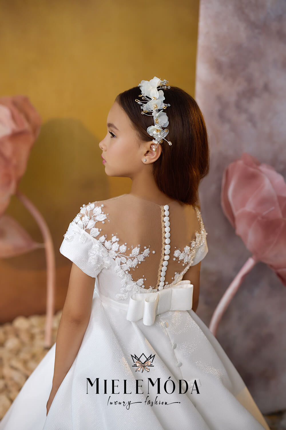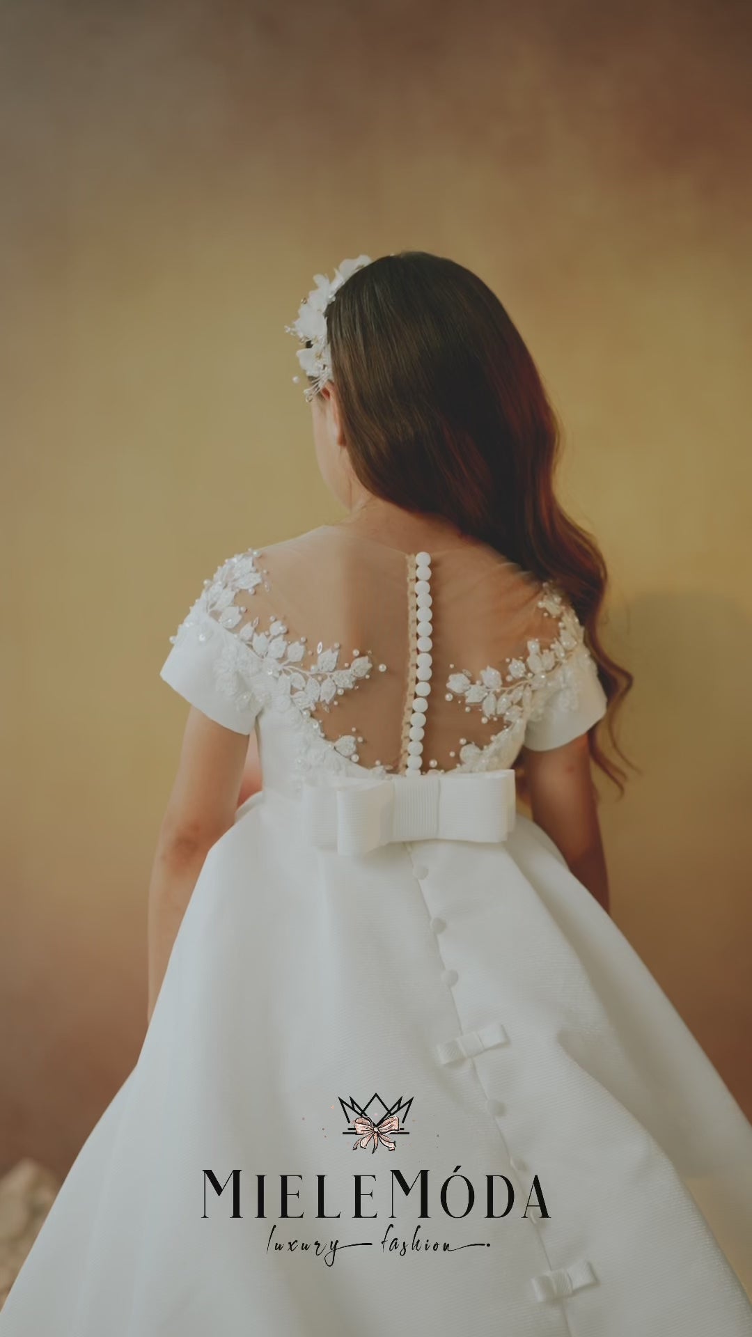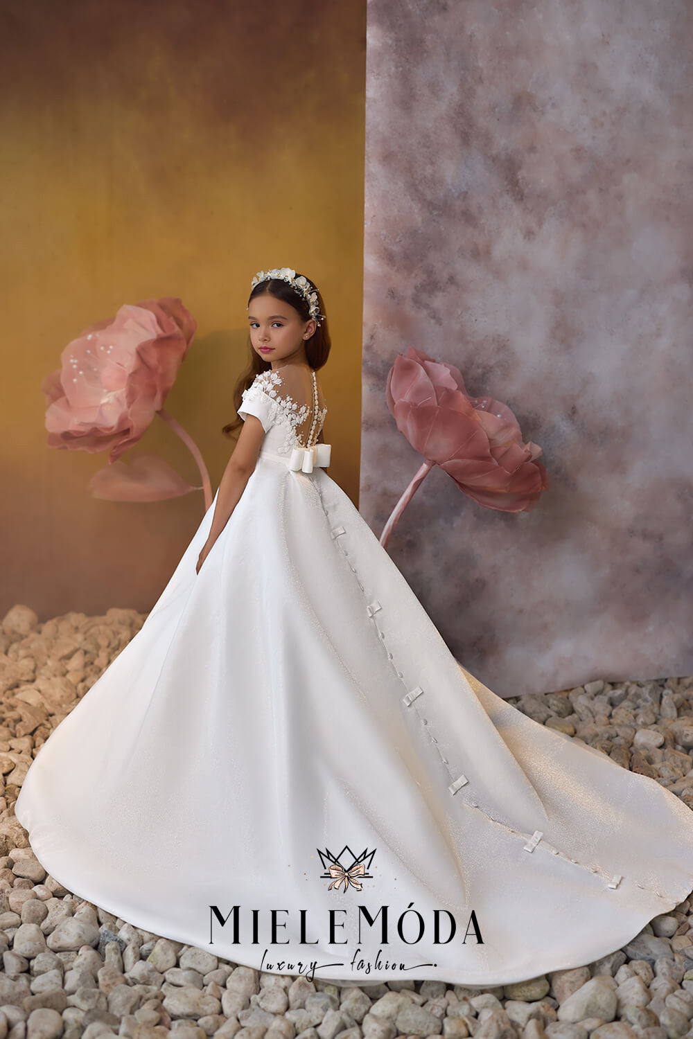 Our exquisite Petal Grace luxury flower girl and first communion dress is a captivating choice for any special occasion. This stunning floor-length A-line princess skirt flows elegantly, while the fitted bodice is adorned with textured lace appliqués and whimsical bows, adding a touch of charm and sophistication. The illusion neckline and delicate cap sleeves create a graceful and timeless look, perfect for flower girls and first communion celebrations. Made from the finest European lace, textured satin, and mesh fabrics, this gown features an elegant ballroom silhouette with a graceful long train. The secure zipper and buttons closure on the back ensures comfort and style, while the fully lined interior offers premium comfort and protection. Designed to make lasting memories, the Petal Grace dress is ideal for creating a picture-perfect moment!