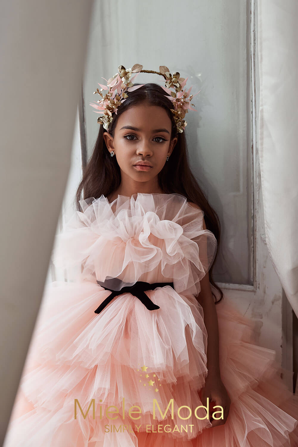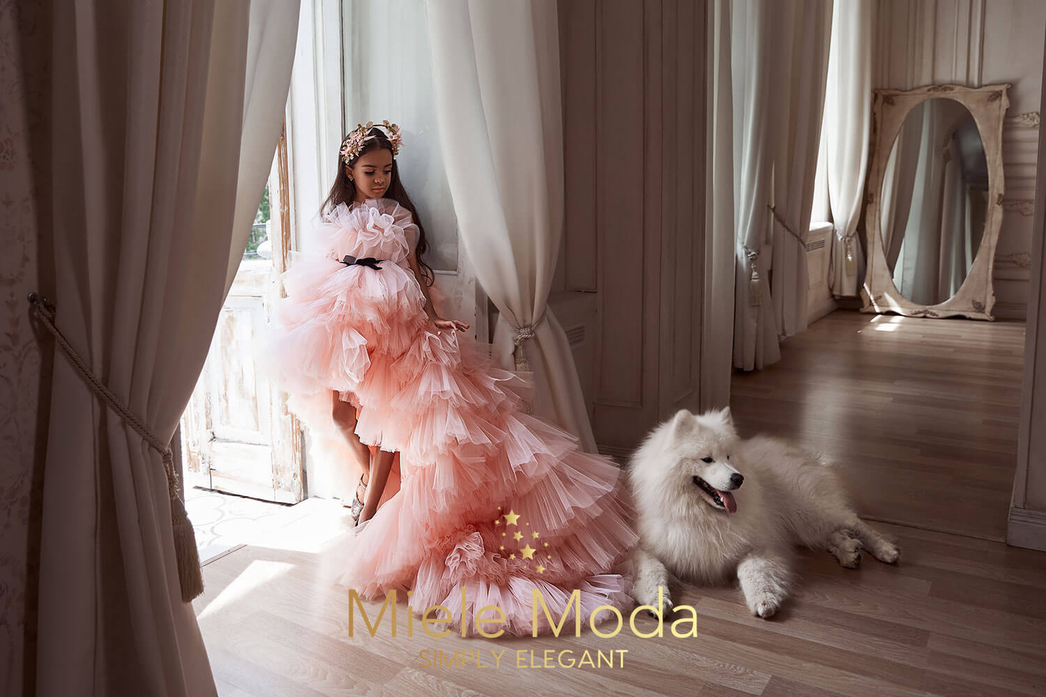 Adrienne is the finest couture birthday dress for your little girls's big day! From the skillful hands of our seamstress in Europe, straight to your little girls fashion fairy tale birthday party, our gorgeous Adrienne dress is the one she will leave all the guests speechless. European elegance and luxury and design this high-low dress offers comfortable wear for her party. Your little fashion star will steal the show in this amazing gown.