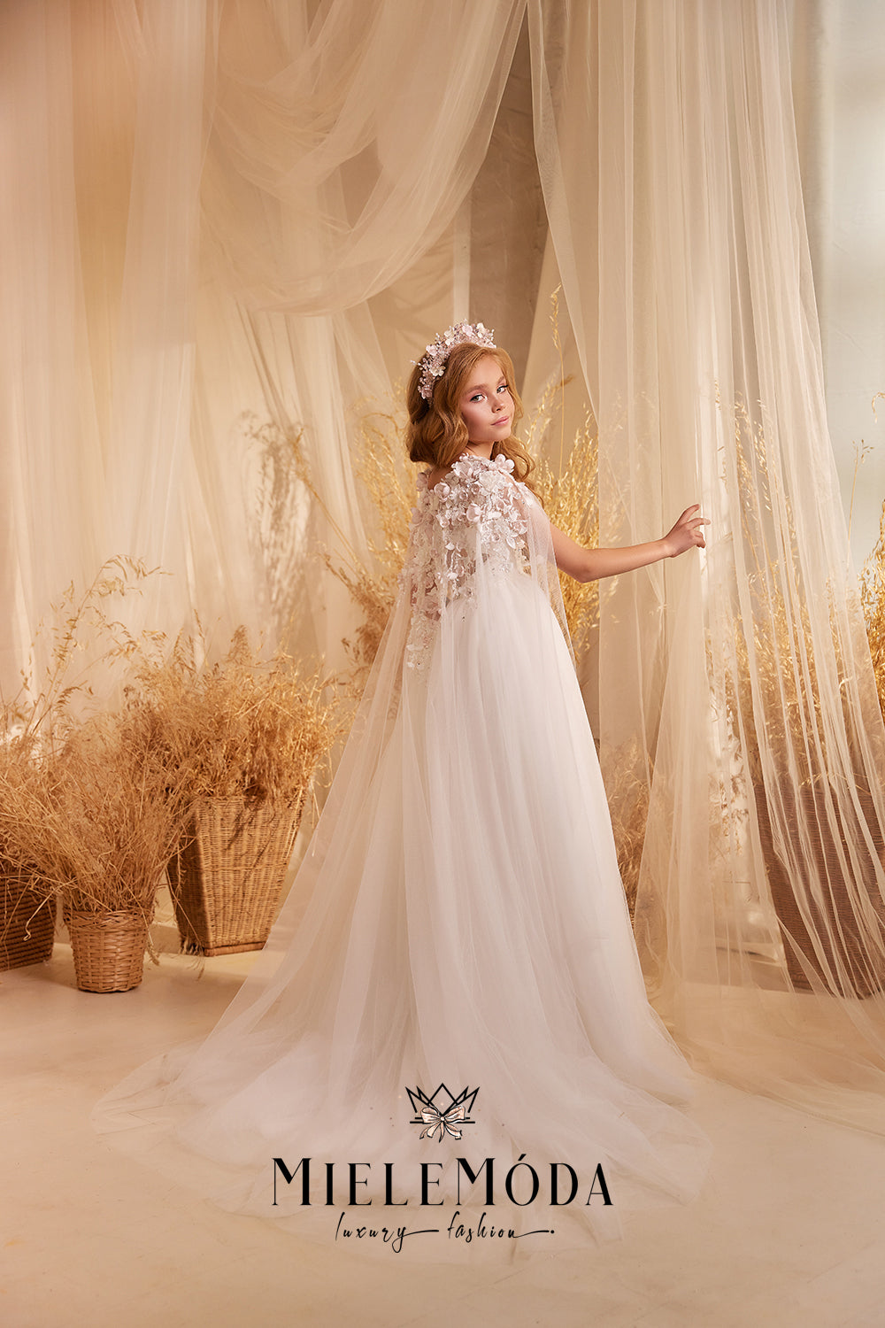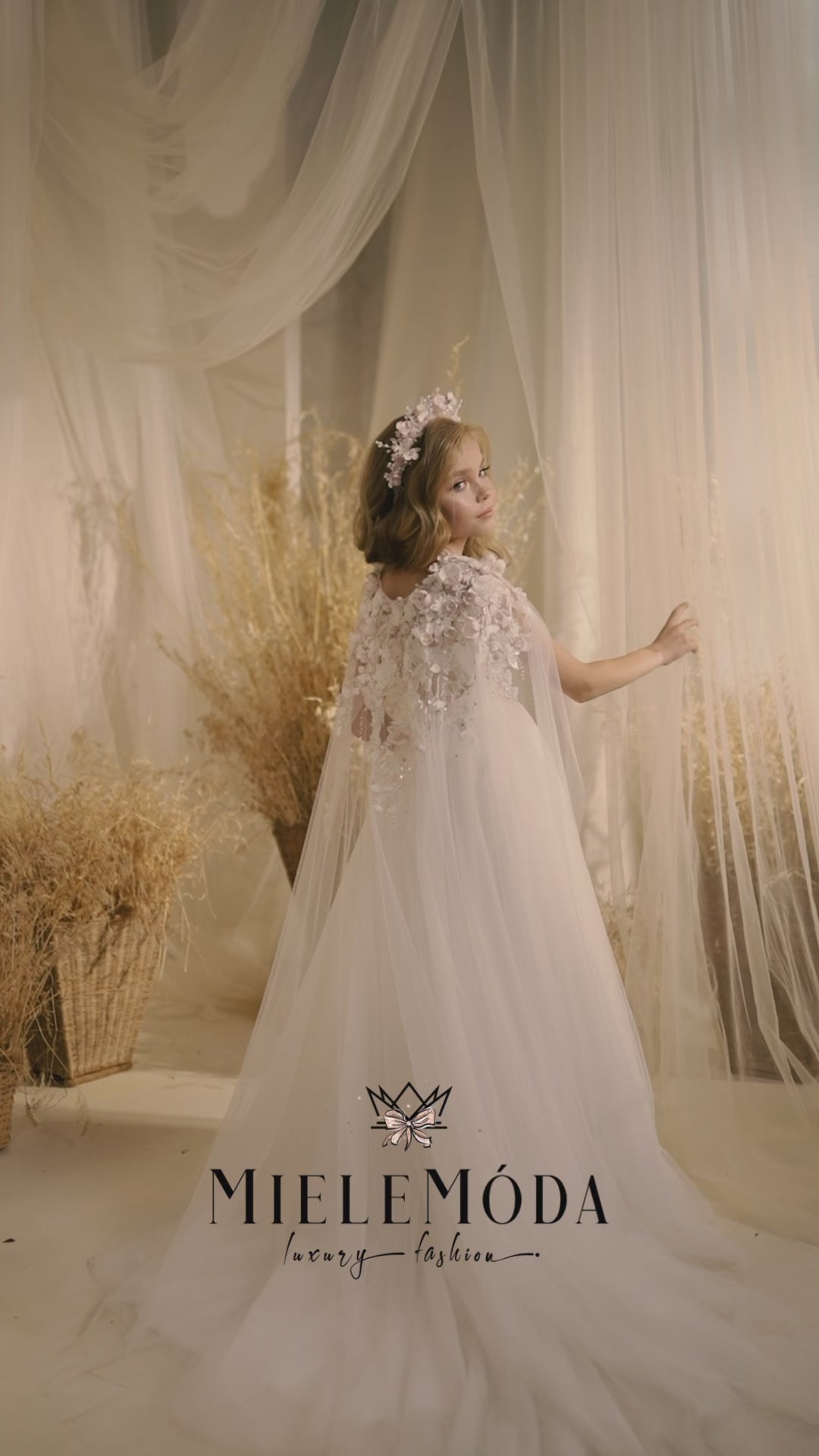 Introducing the exquisite Jessamine couture flower girl and communion dress—a breathtaking blend of elegance and grace. This stunning gown features a fitted bodice adorned with delicate 3D lace appliqué, adding a touch of whimsy and charm. The floor-length, full A-line skirt is multi-layered, creating a regal, princess-like appearance. Sleeveless for a timeless look, it comes with a removable cape, beautifully embellished with matching 3D florals in soft ivory and pale pink hues. Crafted from the finest European lace, satin, and mesh fabrics, the Jessamine gown offers an elegant ballroom silhouette with a graceful long train. The dress is finished with a zipper closure at the back and fully lined for ultimate comfort and protection—perfect for making your little one feel like royalty on her special day.